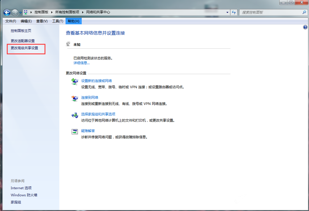 进入以下界面,点击左侧的【更改高级共享设置】,如图,