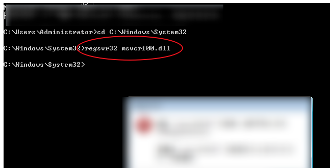 接着输入regsvr32msvcr100.dll命令,回车,看到注册成功,说明msvcr100.dll已经安装好了。