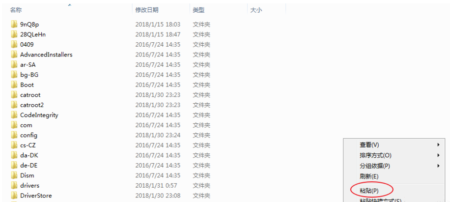 接着找到System32文件夹,打开文件夹,如图,粘贴刚才复制的文件,如果提示已经包含同名文件,则选择【复制和替换】,