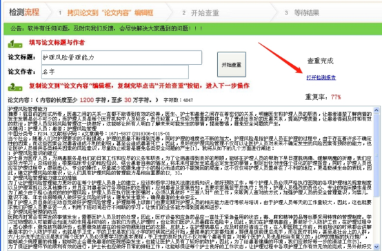 3、查重结束后,可以看到重复率为77%,可以点击“打开检测报告”,查看检测报告,如下图: