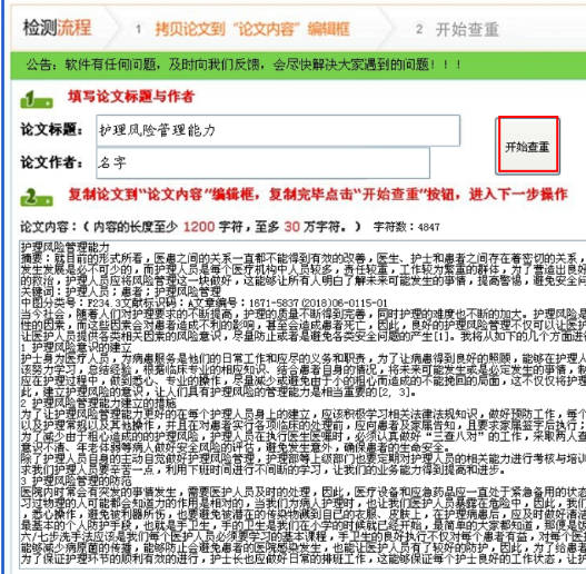 2、在运行界面输入论文的标题、作者名,复制粘贴论文内容,然后点击“开始查重”,如下图: