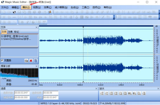 3、接下来,在音乐编辑器Magic Music Editor的左侧栏“文件”中,点击选中该音乐。同时,在右方可以拉动两个倒立的三角形符号来调整所需要剪切的音乐部分。将选区确定后,可以点击音乐编辑器Magic Music Editor菜单栏的“播放”进行试听。
