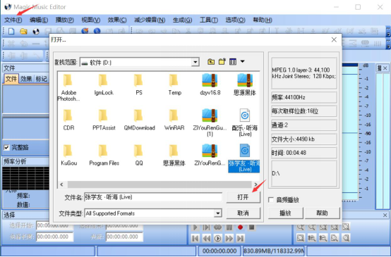 2、在音乐编辑器Magic Music Editor中,点击“文件”,从弹出的“打开”窗口中将需要剪切的音乐打开。