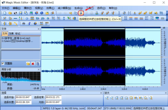 4、点击音乐编辑器Magic Music Editor工具栏上的剪刀符号,即可将选区部分给剪切并且放在剪切板上。