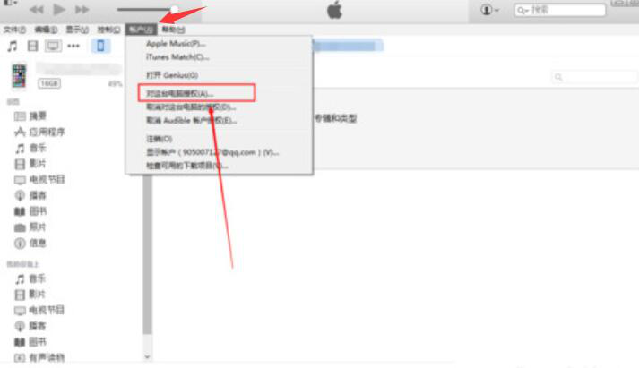 3、接下来,在“账户”菜单项中,选择“对这台电脑授权”,否则,用户是无法使用itunes的。