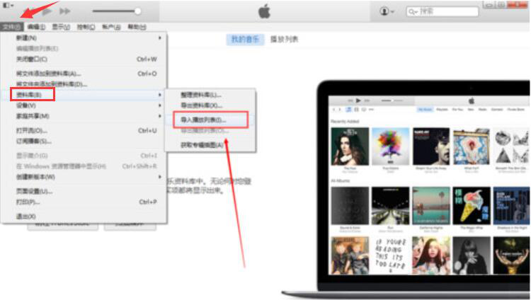 5、授权成功后,用户接着要进行导入的操作。点击“文件”,再点击其下拉菜单中的“资料库”,选择“导入播放列表”的子菜单。