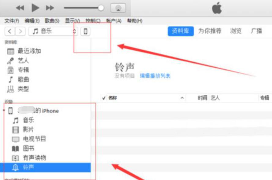 7、想要itunes同步歌曲到手机上,用户还需要点击主界面菜单栏下的手机图标,从而进入下一步的操作。