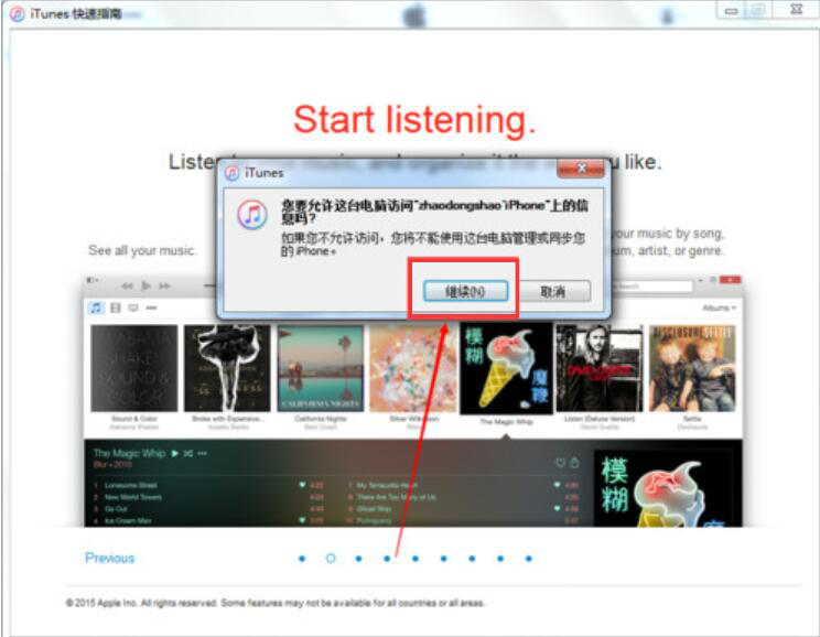 2、然后itunes便会弹出一个提醒的对话框,点击“继续”,这样,后续itunes同步歌曲到手机上的操作才能成功。
