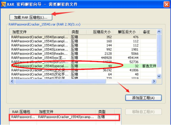 2、接下来,在RAR Password Cracker中,点击“加载RAR压缩包”,在压缩包列表中单击要破解密码的rar文件,再点击“添加至工程(A)”的按钮。此时,用户可以发现要破解密码的rar便会出现在下方的展示框中。