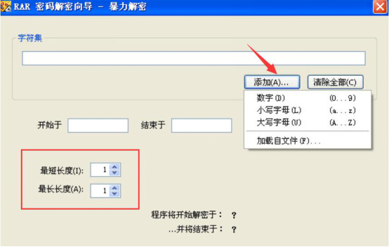 4、接下来在RAR Password Cracker的暴力破解向导页里,用户根据自己设置密码的习惯,点击“添加”来添加字符,并设置密码的最短和最长长度。