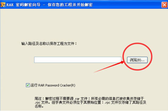 5、最后,在“保存你的方案并开始破解”向导页中,点击“浏览”按钮设置文件保存的位置,并在其左边的文本框中给文件命名。之后,点击向导页下方的“完成”按钮。RAR Password Cracker便开始破解rar密码。