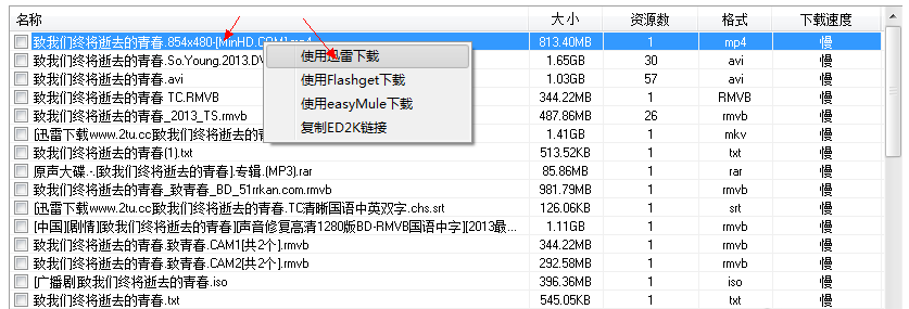 等待片刻,得到搜索结果,选择其中一个文件资源(建议选择720p),鼠标右击,选择【使用迅雷下载】,