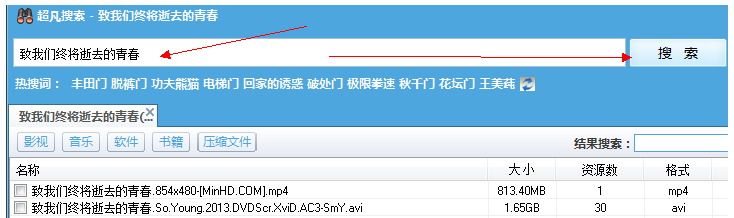 打开P2psearcher软件,进入界面,如图,在上方选框中输入关键词,例如“致我们终将逝去的青春”,然后点击搜索按钮,