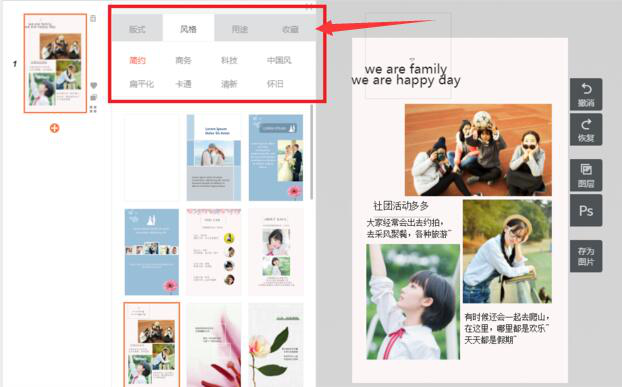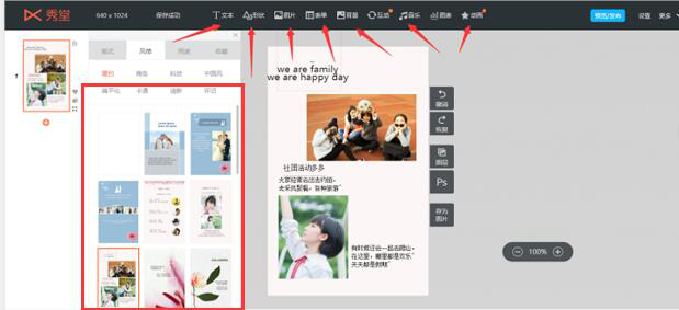 7、在秀堂h5的左上方工具中,用户可以切换到风格、用途来丰富h5页面的样式和风格。