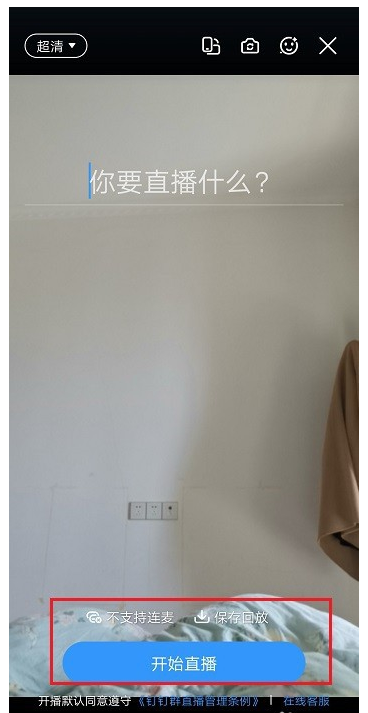 2、进入如下界面,你可以设置画质清晰度,例如【超清】,输入直播标题,然后点击【开始直播】;当然了,你还可以选择是否连麦、保存回放,