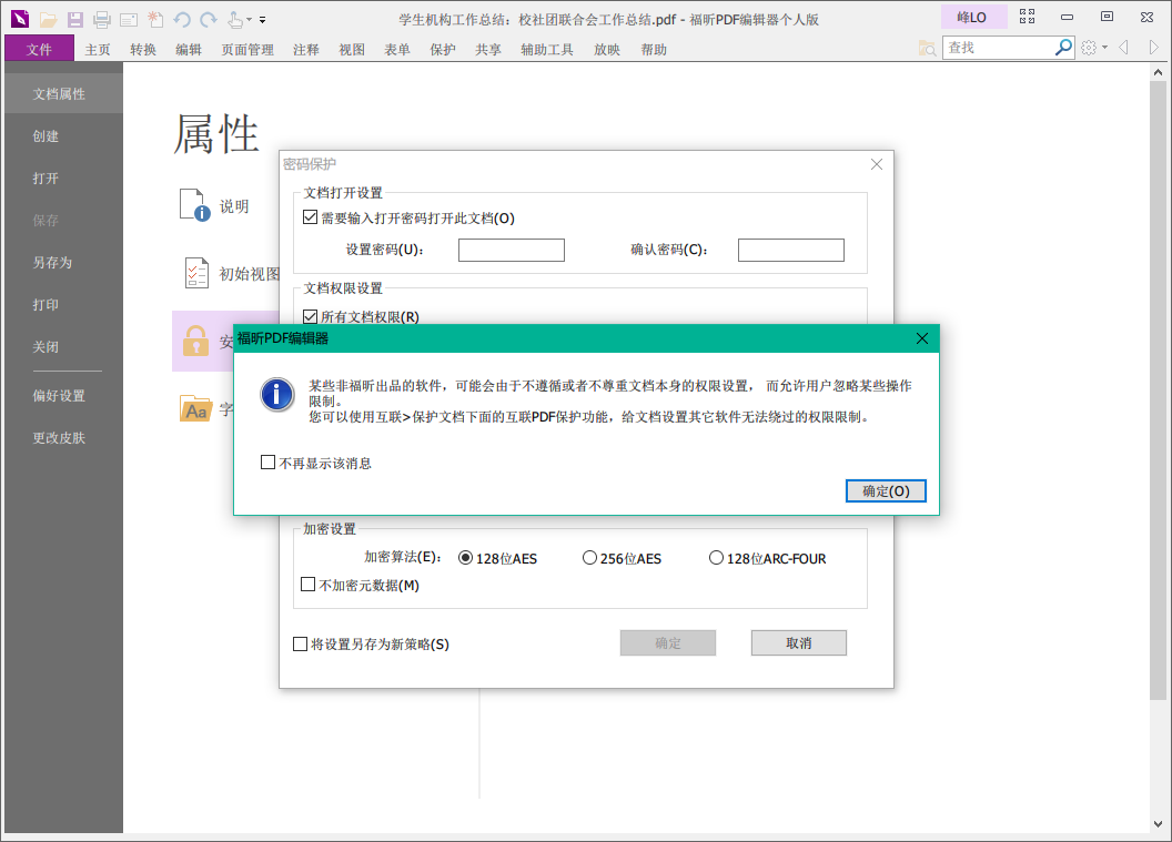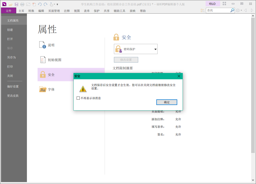 4、设置完成,点击确定,福昕PDF编辑器会出现提示,保存文档之后安全设置才会生效,最后点击确定即可。