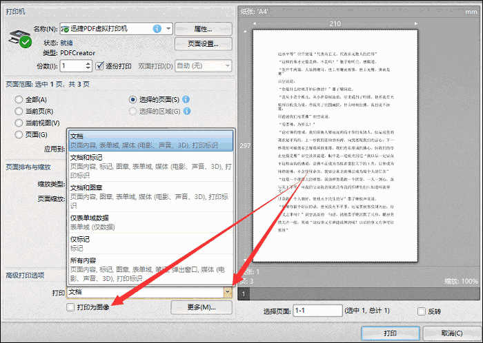 返回到PDF虚拟打印机窗口,点击【高级打印选项】,在展开菜单中可以选择打印内容,包括文档、文档和标记、所有内容等等,也可以勾选【打印为图像】,