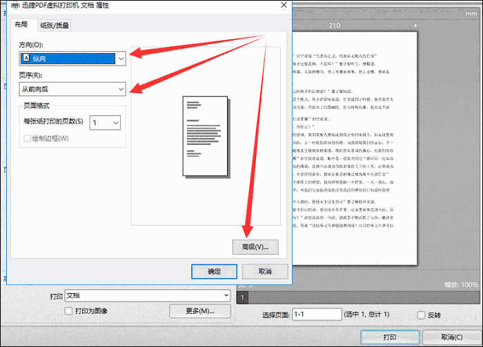 你可以调整纸张方向(横向或者纵向),另外,你还可以针对页序、纸张颜色进行设置,接着点击下方的【高级】选项,