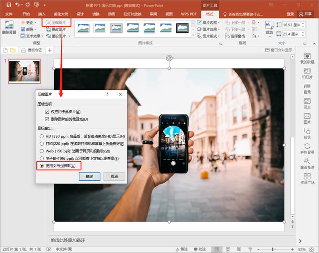 新建一个PPT演示文稿,插入幻灯片,导入一张需要压缩的图片,选中这张图片,在菜单栏中点击【格式】——【压缩图片】,弹出对话框,勾选【使用文档分辨率】,点击确定。
