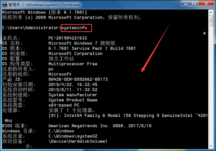 2、如图,在红色框的位置输入systeminfo,点击回车,即可在当前页面中查看电脑配置信息。