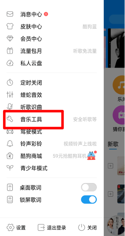 展开菜单面板,如图,点击选择【音乐工具】,