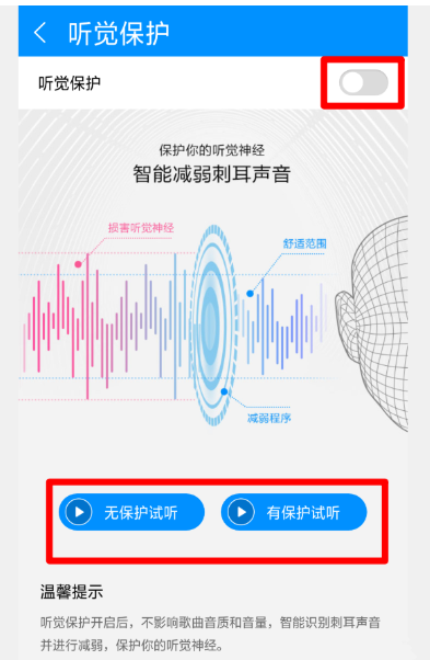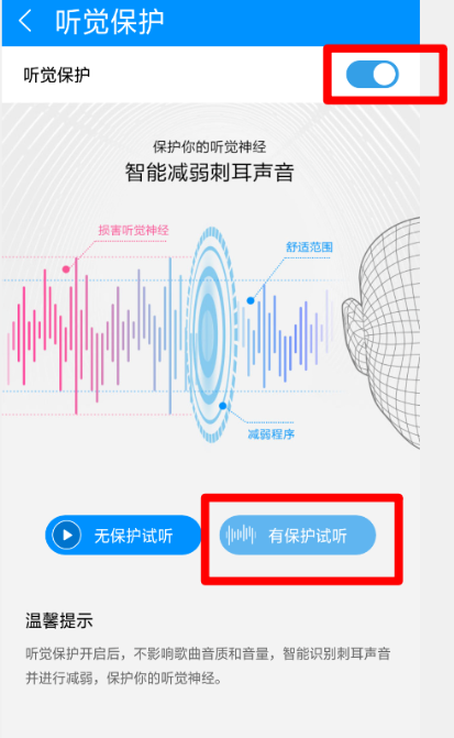 勾选启用听觉保护功能,软件可以智能识别刺耳声音并进行减弱,并且不会影响歌曲音质和音量。