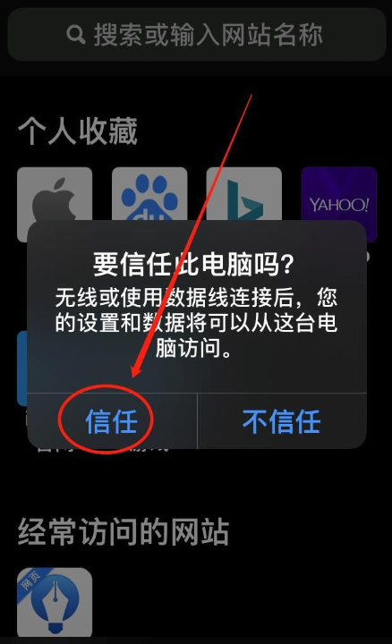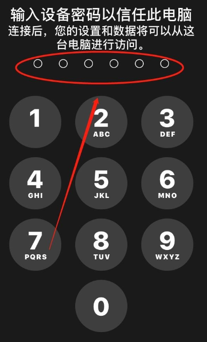 使用数据线连接iPhone手机和电脑,如图,在手机端点击【信任】,设置输入设备密码,授权信任电脑,