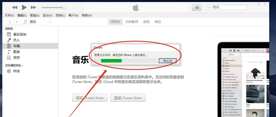 首先需要在电脑中下载安装iTunes软件,打开软件,进入界面,如图,点击【继续】,允许这台电脑访问iPhone,接着在手机端进行授权,