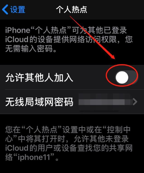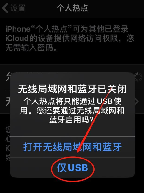 接着开启iPhone手机热点,进入设置界面,点击【个人热点】——【允许其他人加入】,出现提示,选择【仅USB】,通过USB使用个人热点,