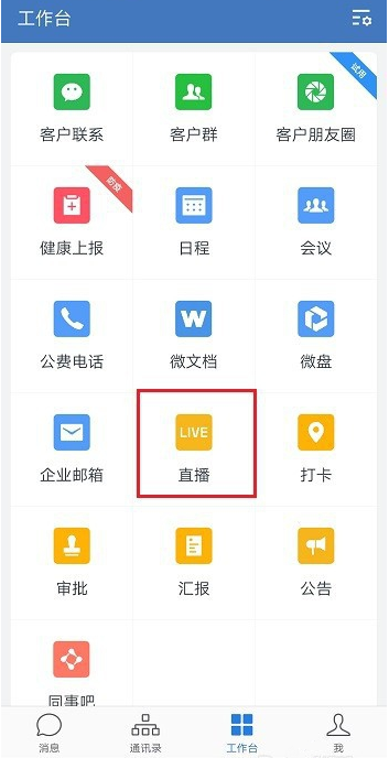 打开企业微信,登录账号,进入主页,点击下方的【工作台】,选择【直播】功能,