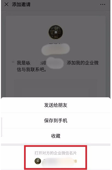 这时会出现菜单选项,如图,点击【打开对方的企业微信名片】,
