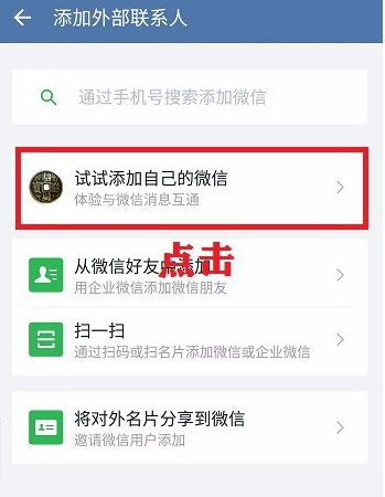 如图,现在添加外部联系人,点击【试试添加自己的微信】,