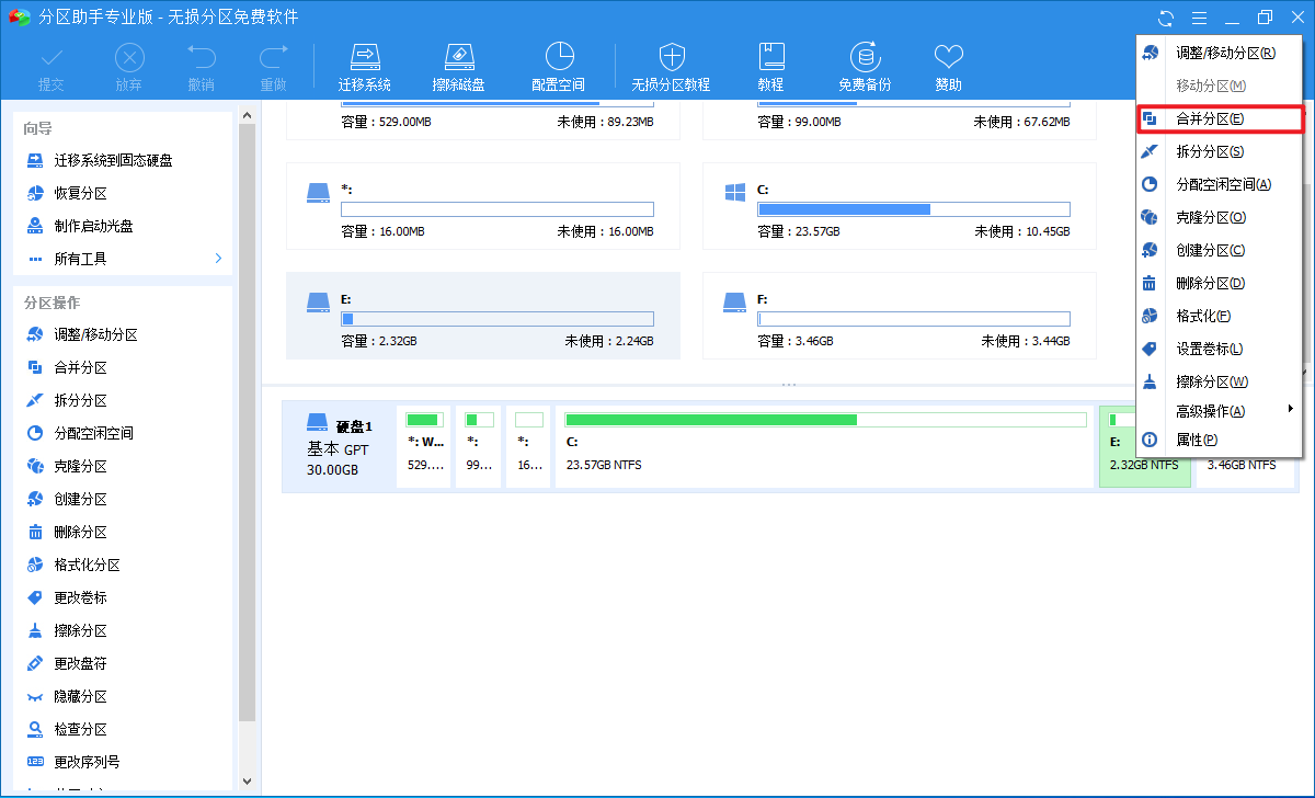 打开分区助手,进入界面,鼠标右击需要合并的分区(E盘),弹出下拉菜单,选择【合并分区】,