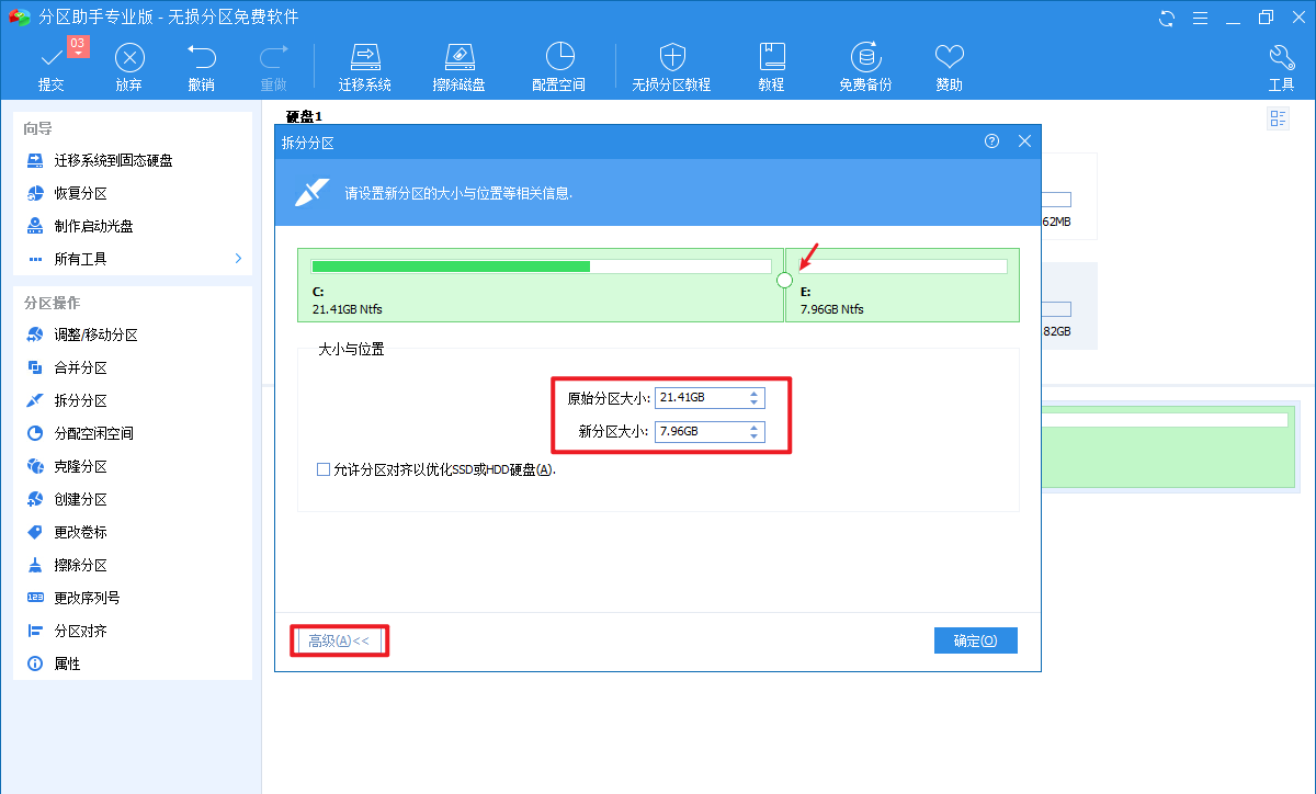 弹出窗口,如图,向左拖动箭头,确定新分区的大小与位置;或者,你也可以直接设置原始分区和新分区的大小,点击确定,