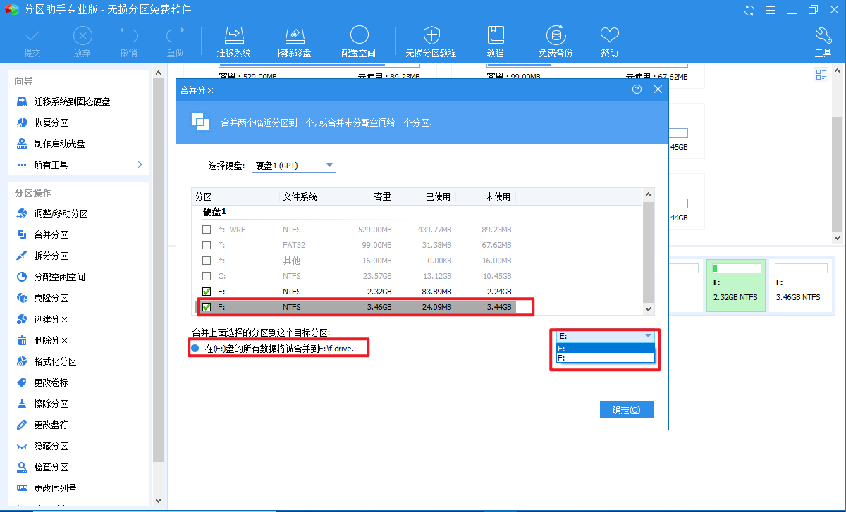 弹出窗口,勾选需要合并的另一个分区(F盘),然后选择目标分区(E盘),这里会有提示,F盘的所有数据将被合并到E:\\f-drive文件夹,点击确定,