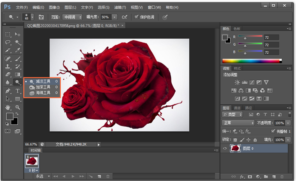 使用鼠标右击,弹出菜单,这里有三个工具,分别是【减淡工具】、【加深工具】、【海绵工具】,