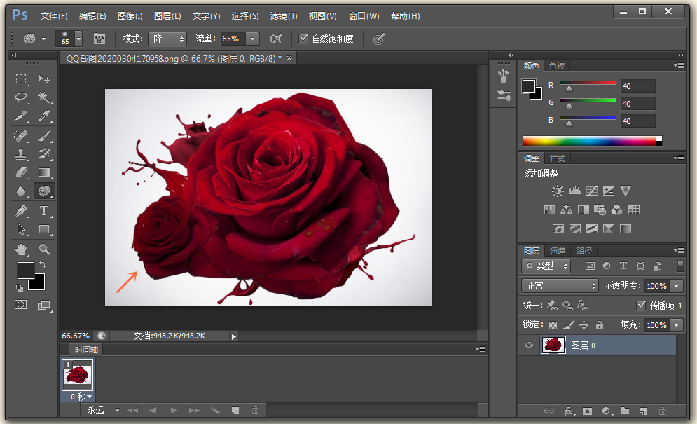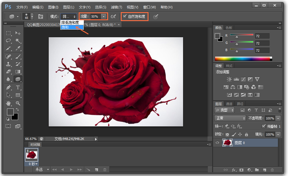 如果你选择【模式】——【降低饱和度】,设置流量为100%,即进行去色处理,图片直接变为灰色。