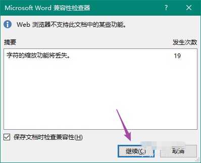 出现提示,查看MicrosoftWord兼容性检测器,如图,点击【继续】,