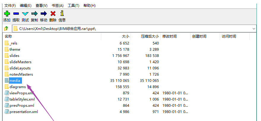 点击打开ppt文件,找到media文件夹,这里存储了Word文档中的所有图片,而且图片自动按序号进行排序。