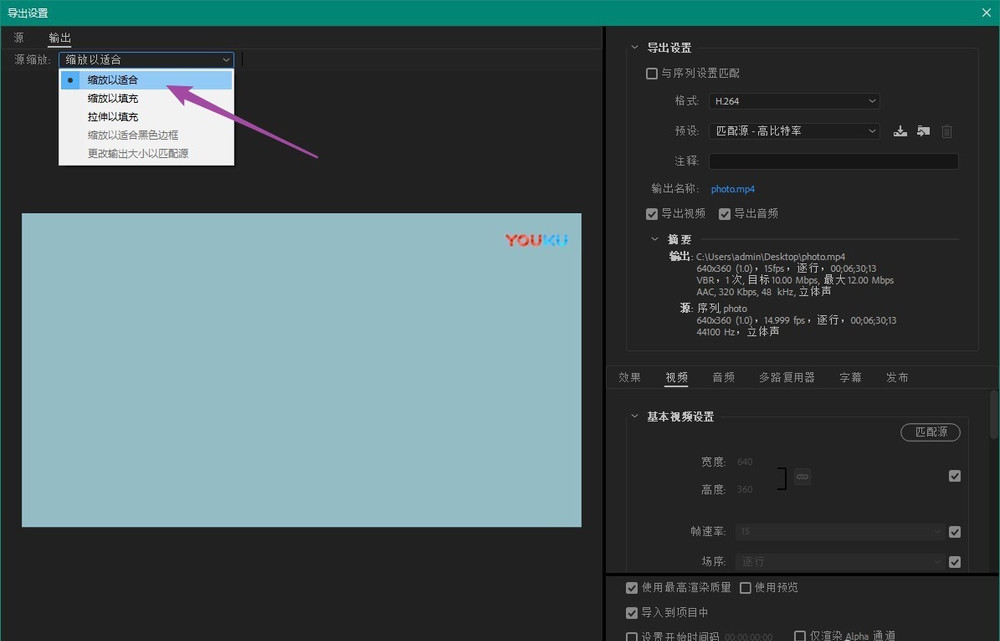 进入【导出设置】窗口,如图,在左上角点击【输出】——【源缩放】——【缩放以适合】命令,
