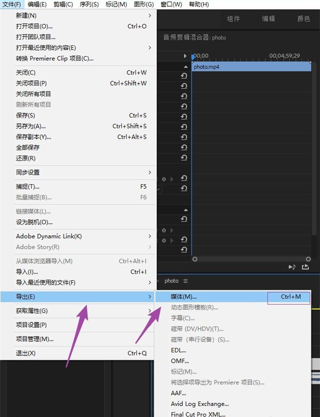 剪辑完成,在上方菜单栏中点击【文件】——【导出】——【媒体】选项,或者在窗口界面点按快捷键【Ctrl+M】,