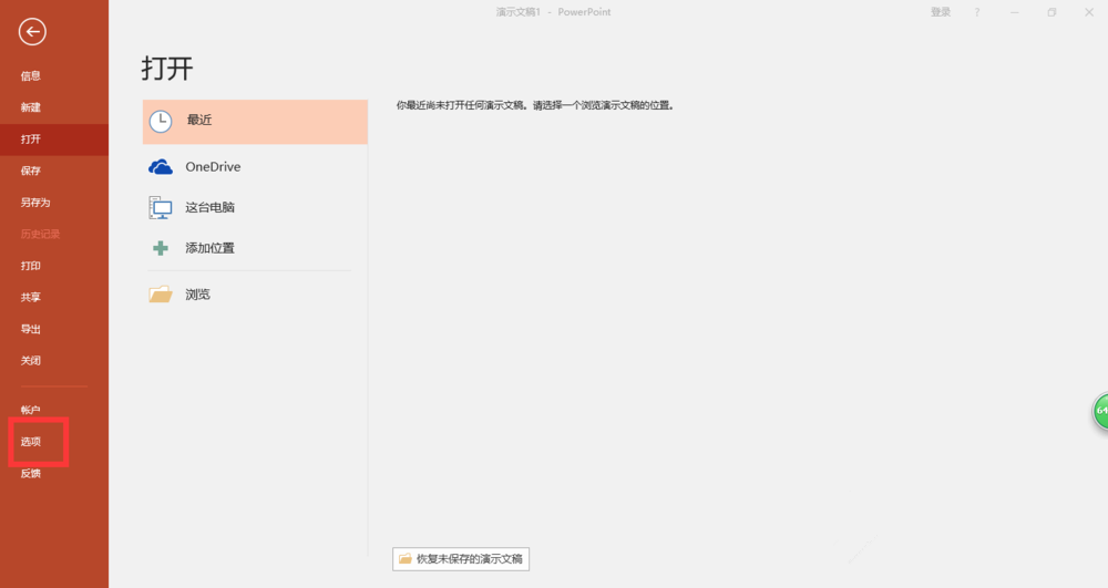 新建一个PPT文稿,如图,在菜单栏中点击【文件】——【选项】命令,