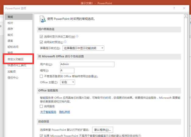 新建一个PPT演示文稿,如图,上方菜单栏中并没有开发工具选项卡,使用鼠标右击功能区,弹出选项,点击【自定义功能区】,