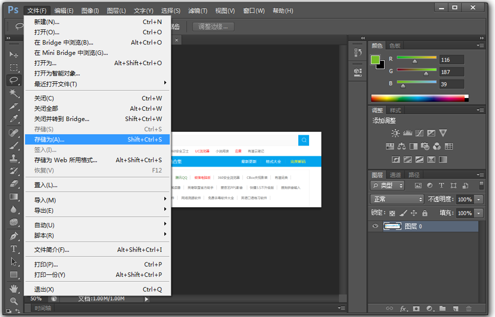 将图片导入PS软件,在菜单栏中点击【文件】——【存储为】,快捷键【Ctrl+Alt+S】,