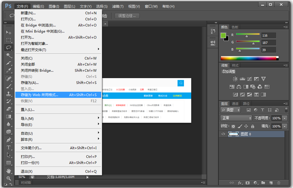 将图片导入PS软件,在菜单栏中点击【文件】——【存储为Web所用格式】,快捷键【Ctrl+Alt+Shift+S】,