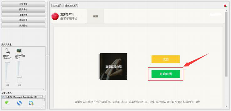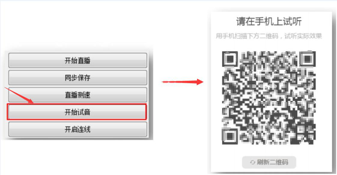 3、回到荔枝直播助手的主界面,点击功能栏的“开始试音”按钮,并且用自己的手机来扫它自动生成的二维码进行试听,