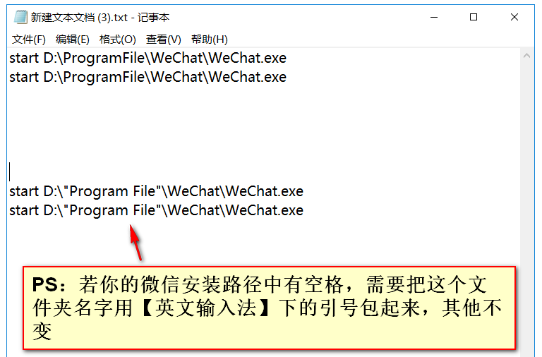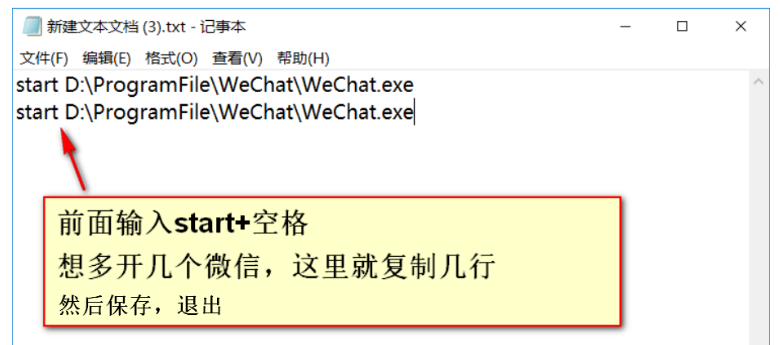 3、如果路径带有引号,将引号去掉,接着在路径前面输入【start+空格】,选中这一行,进行复制粘贴,需要登录几个微信,则复制几行,
