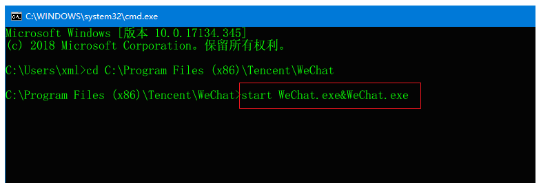 3、接着输入【start+微信文件名】 ,注意空格,如图所示;你需要几个微信,就复制几个【&WeChat.exe】,