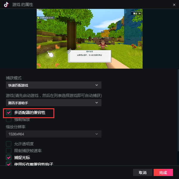 用户需要提前下载腾讯游戏助手,并开启游戏。然后在上一步抖音直播伴侣弹出的界面可以看到“绝地求生”、“英雄联盟”等,这里我们是要做手机游戏直播,选择“腾讯手游助手”,并勾选“多适配器的兼容性”,即可看到手机游戏助手里的游戏界面已出现在抖音直播伴侣界面中,点击完成即可。