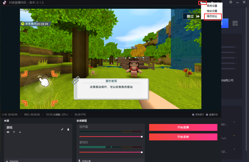 然后点击右上角设置按钮,推流地址,在弹出界面填入推流地址,点击开始直播即可。